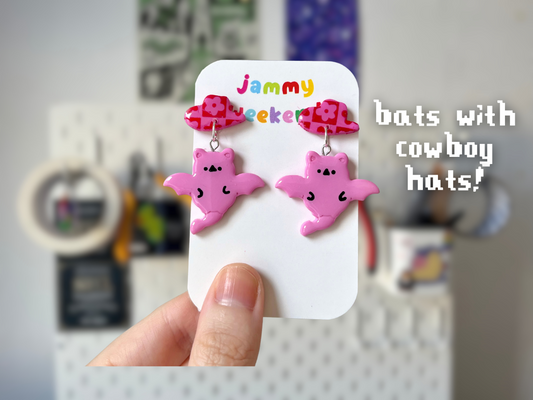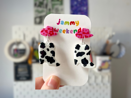 Cow Print Cowboy Boots with Pink Hat Earrings