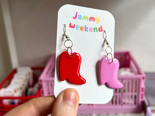 Pink and Red Checkerboard Cowboy Boots Clay Earrings
